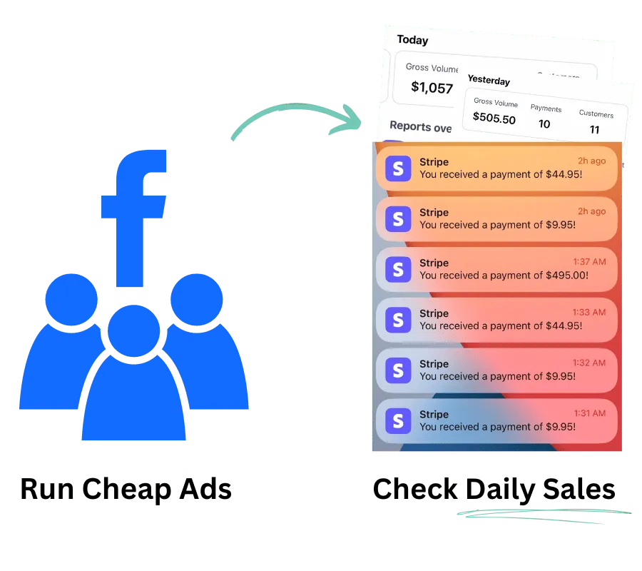 2️⃣ We'll teach you how to set up Facebook ads to get sales on autopilot for as little as $5 per day